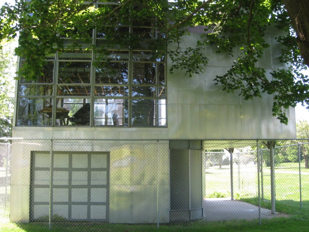 Unfortunately, I wasn’t able to connect with Michael Schwarting, longtime Aluminaire restoration director, in time to arrange access to the inside of the structure. Schwarting is director of NYIT’s graduate program in Urban and Regional Design. During a previous chat with him about my thesis on postwar steel prefab Lustron Homes, he had indicated that with the transfer of his program to another NYIT campus, the future of the Aluminaire was yet again in question.