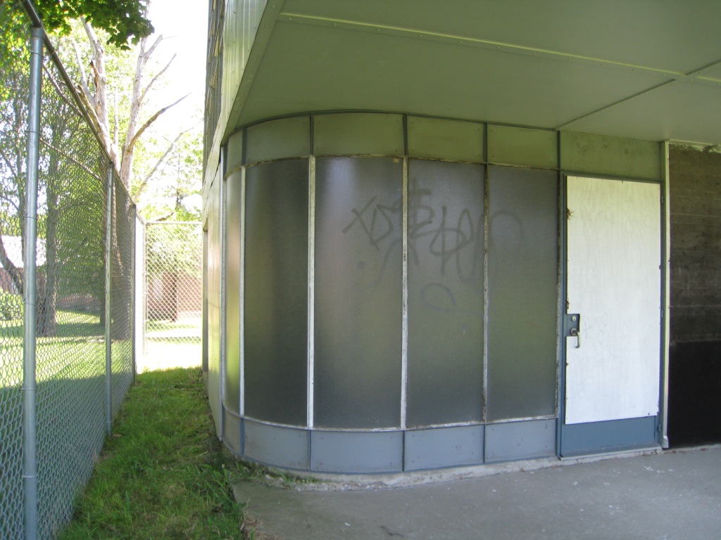 Signs of previous graffiti defacement explain the chain-link fence surround.