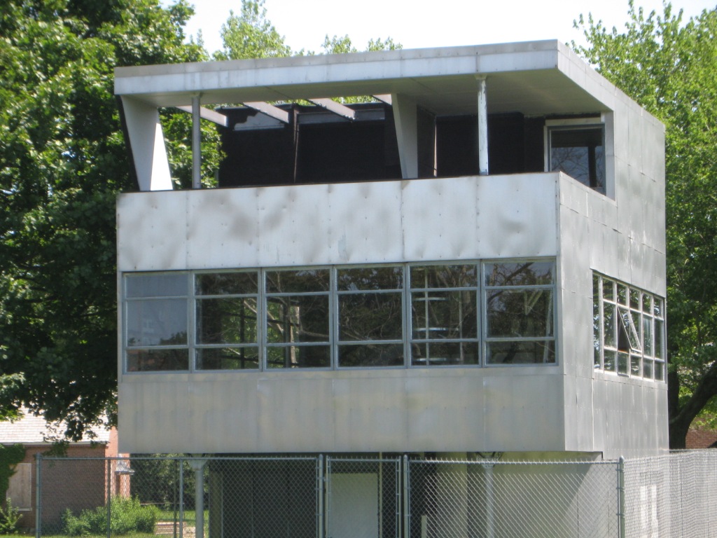 This summer I finally got a chance to trek out to Central Islip, Long Island, in hopes of tracking down the house on the campus of the New York Institute of Technology. With help from a campus security guard, I was thrilled to finally spot the elusive Aluminaire, the afternoon sun glinting off of its aluminum skin.