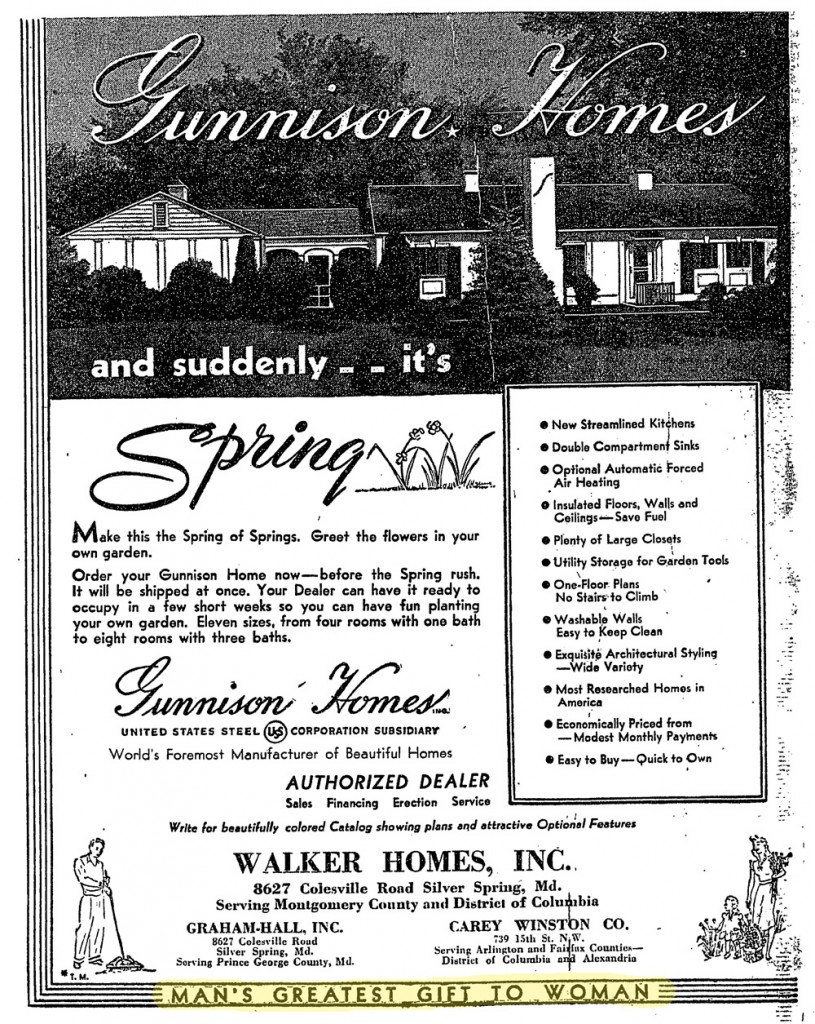 1947 Gunnison Homes “Man’s Greatest Gift to Woman” ad placed by local dealer Walker Homes, Inc.